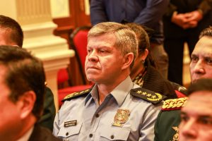 El Presidente de la República, Santiago Peña Palacios, junto al Ministro del Interior, Enrique Riera Escudero, y el Comandante de ...